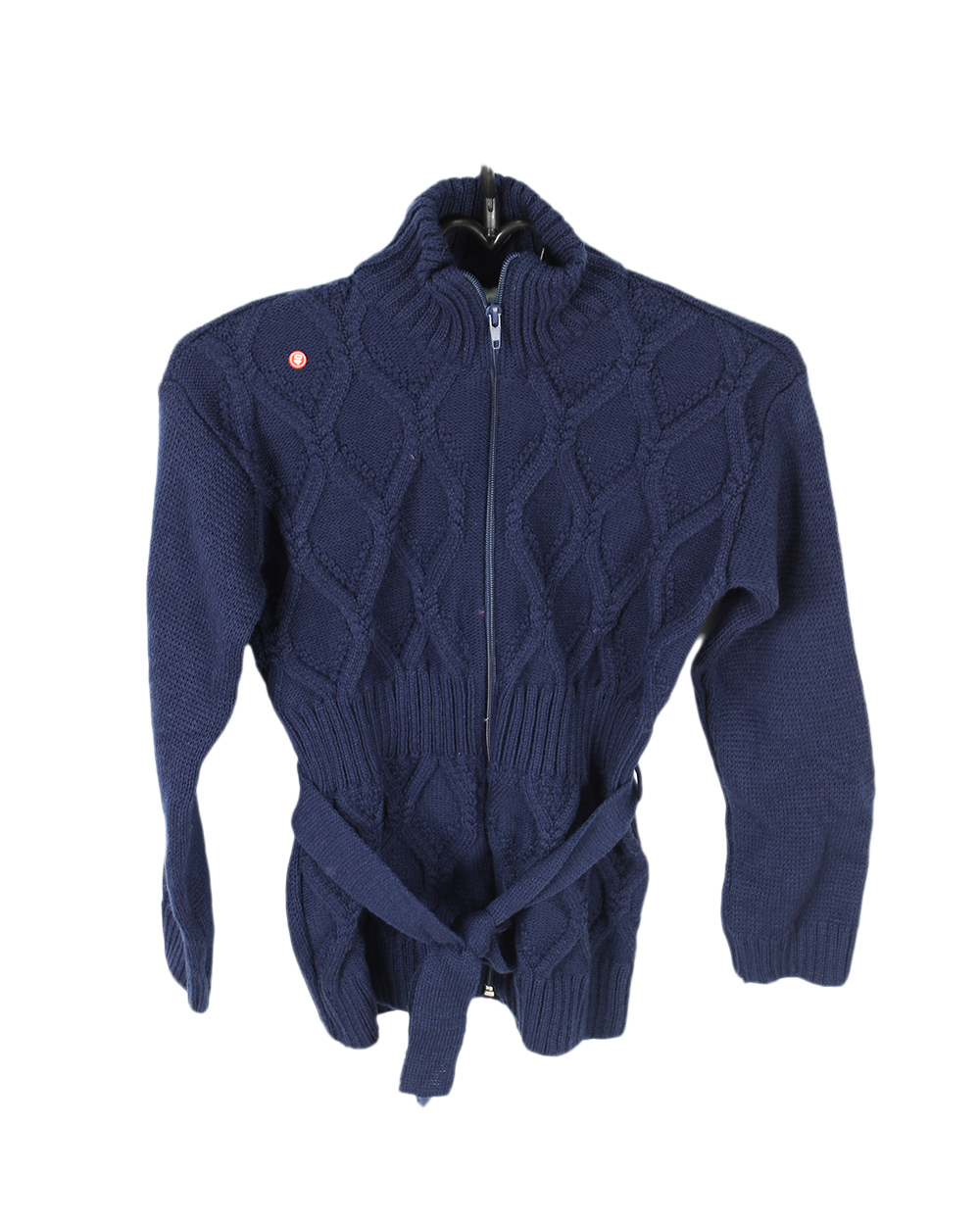Симпатичный детский джемпер темно синего цвета с оригинальной вязкой. Застегивается на молнию.