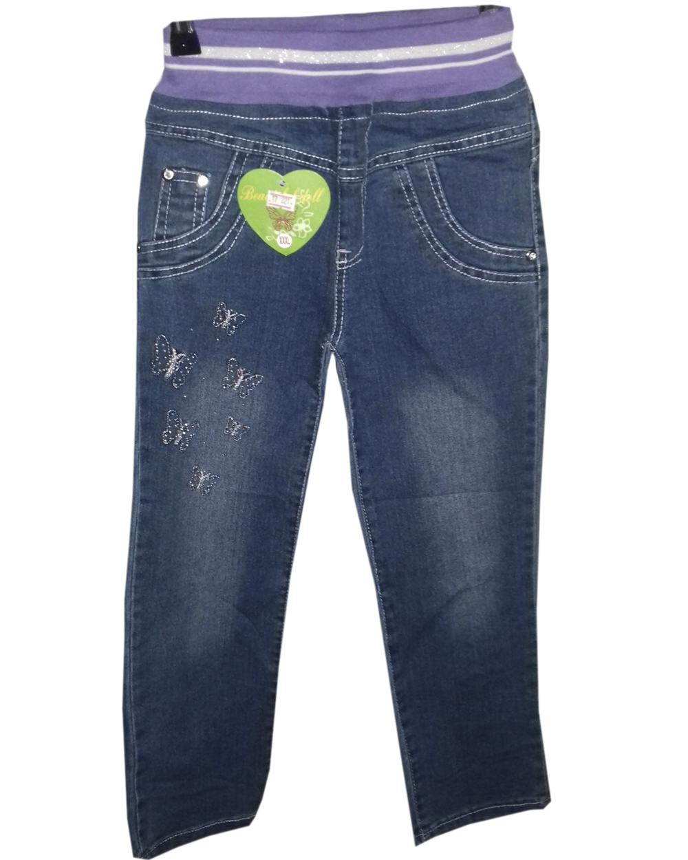 Джинсовые штаны зауженные книзу. Украшена модель изображением бабочек. Пояс мягкий, дополнен резинкой.
