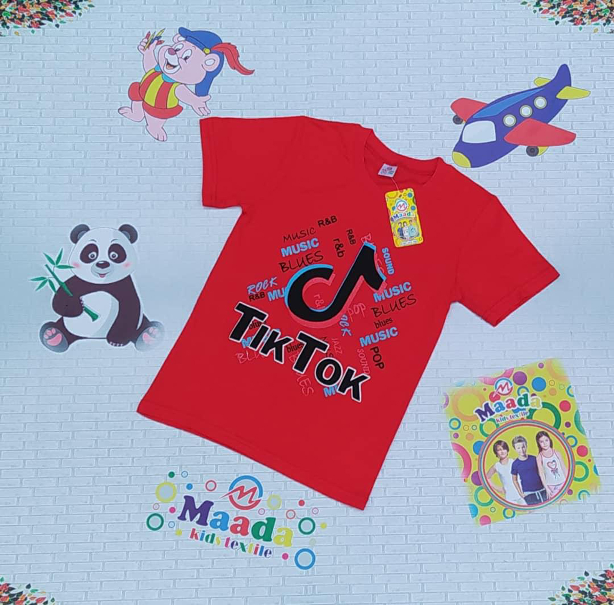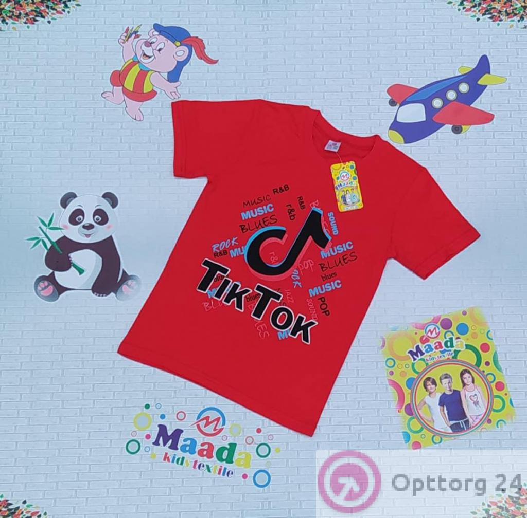 Описание: Футболка детская из хлопка насыщенного красного цвета, с принтом Tik-Tok. У футболки короткий рукав, округлая горловина.