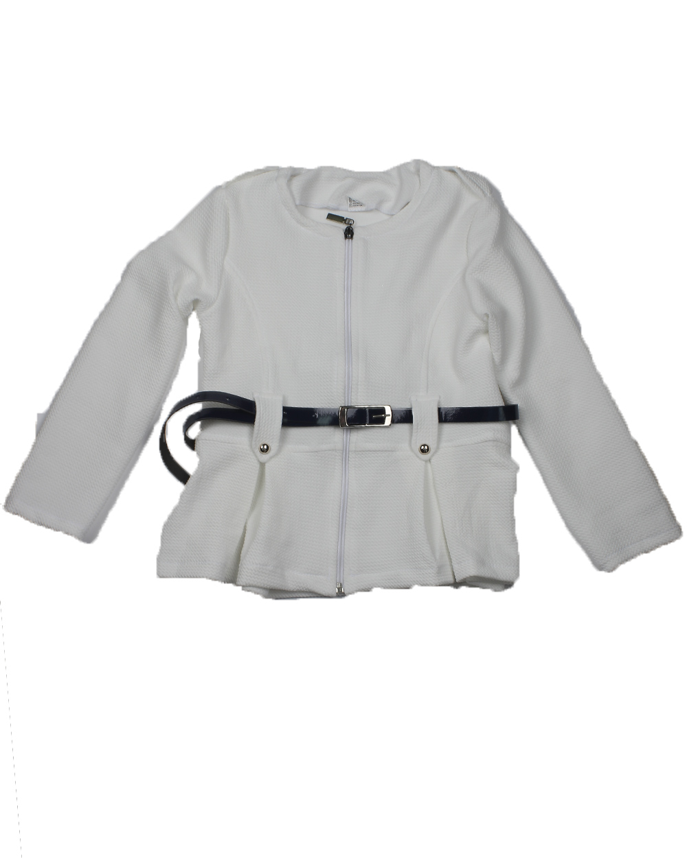 Детский кардиган белого цвета с поясом из экокожи черного цвета.