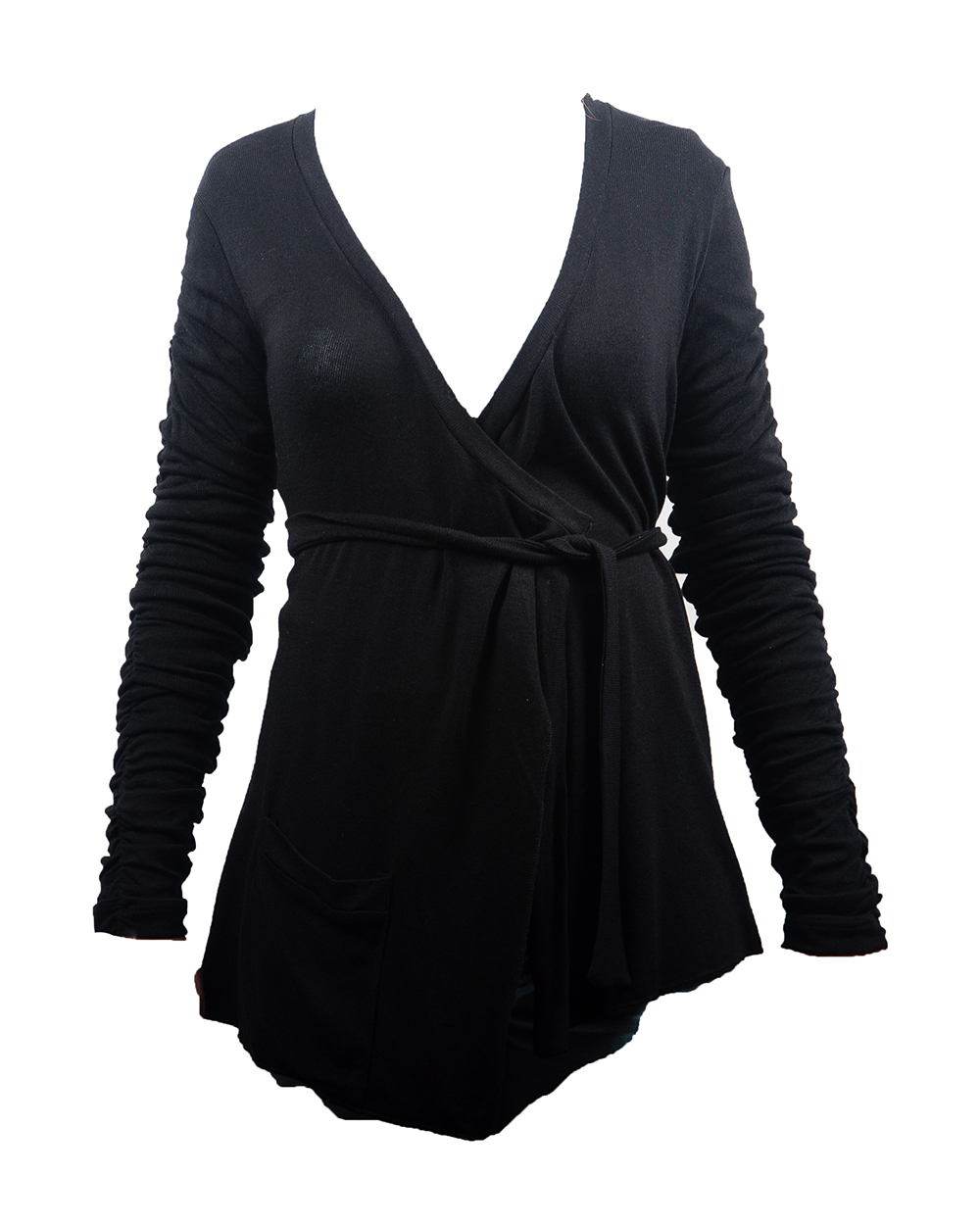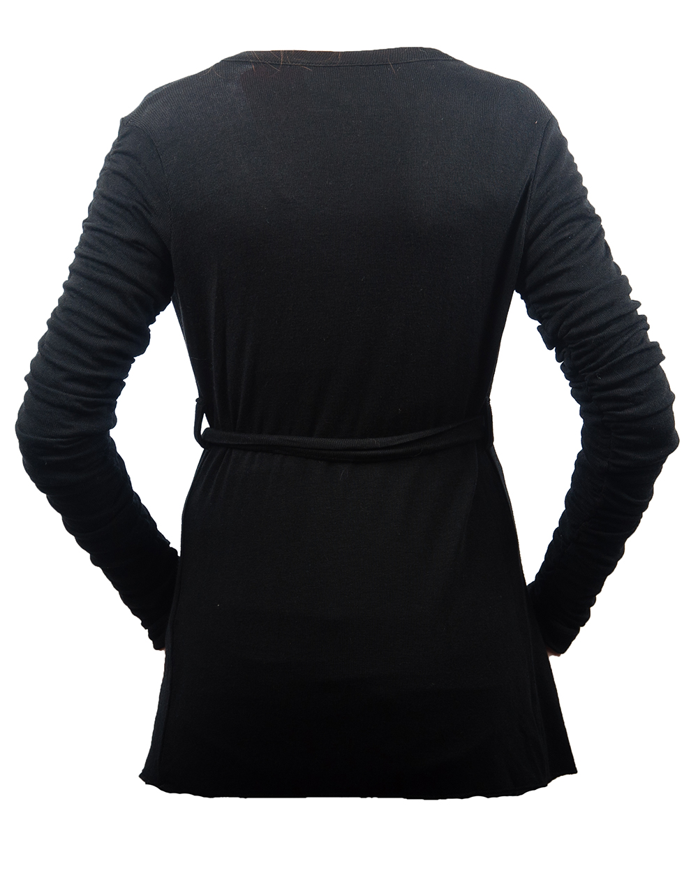 Кардиган - универсальная вещь в любом гардеробе, тем более классического черного цвета. Данная модель имеет ассиметричные края, а талия подчеркнута пояском. Отличный вариант для повседневного гардероба.
