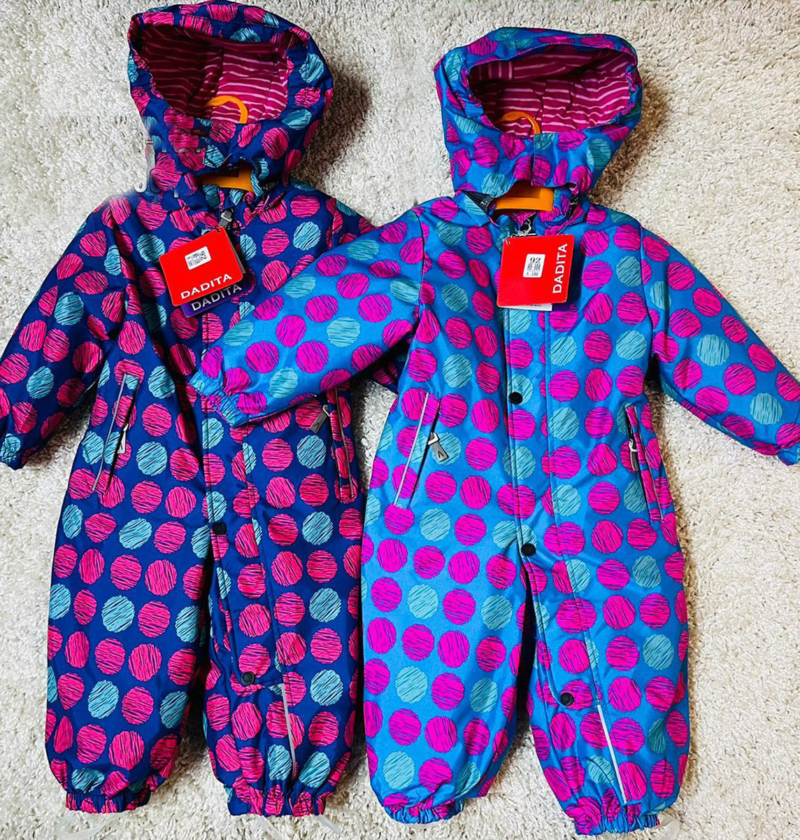 Описание: Комбинезон детский сплошной для девочки в крупный горох. Высокий воротник, застегивается на молнии с ветрозащитной планкой на кнопках. Манжеты рукавов и низ штанов на резинке, есть два кармана. Много светоотражающих элементов.