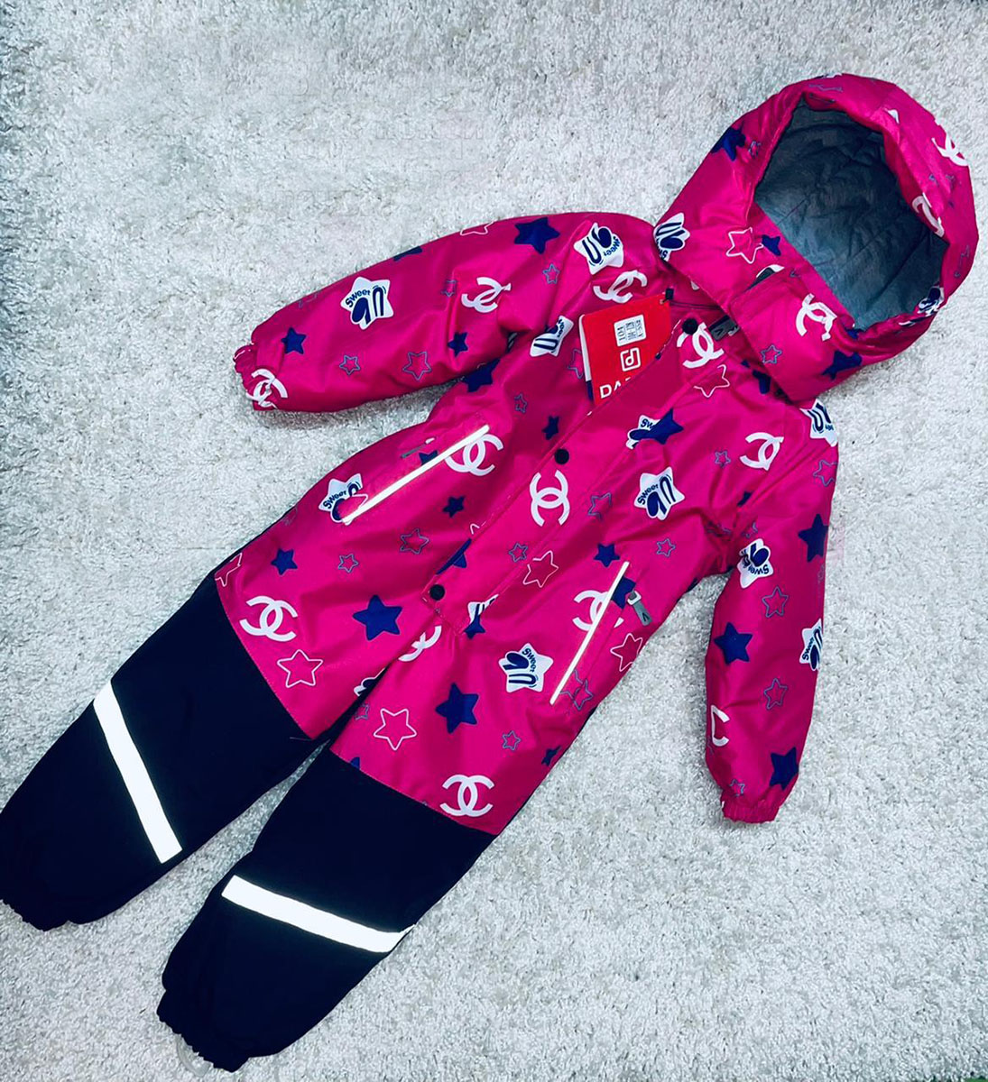 Описание: Комбинезон детский сплошной для девочки выполнен в розово-синих тонах, с принтом звездочек. Высокий воротник, застегивается на молнии с ветрозащитной планкой на кнопках. Манжеты рукавов и низ штанов на резинке, есть два кармана. Много светоотражающих элементов.