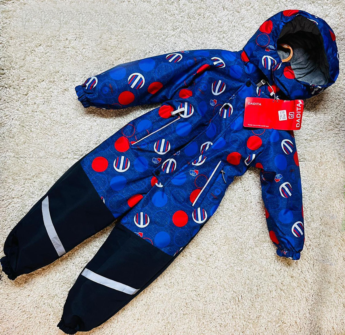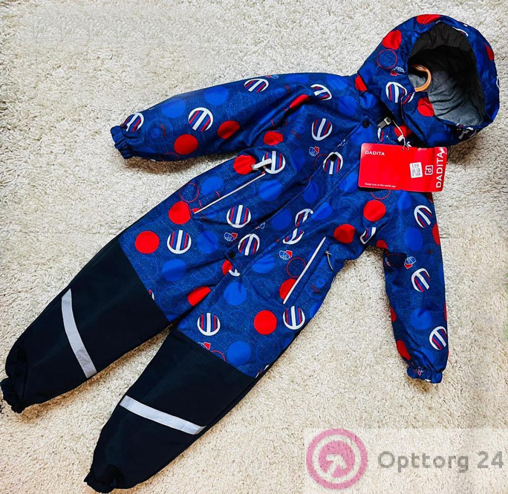 Описание: Комбинезон детский сплошной для мальчика выполнен в синих тонах с принтом крупный горох. Высокий воротник, застегивается на молнии с ветрозащитной планкой на кнопках. Манжеты рукавов и низ штанов на резинке, есть два кармана. Много светоотражающих элементов.