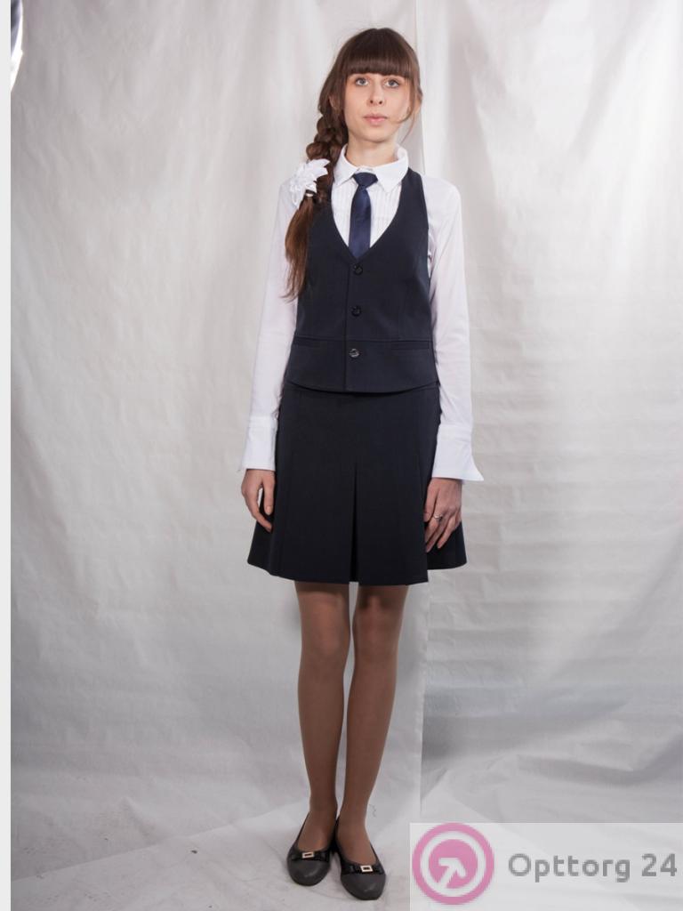 Школьная форма костюм двойка юбка + жилет, модель синего цвета жилет с карманами на пуговицах, классическая юбка до колен.