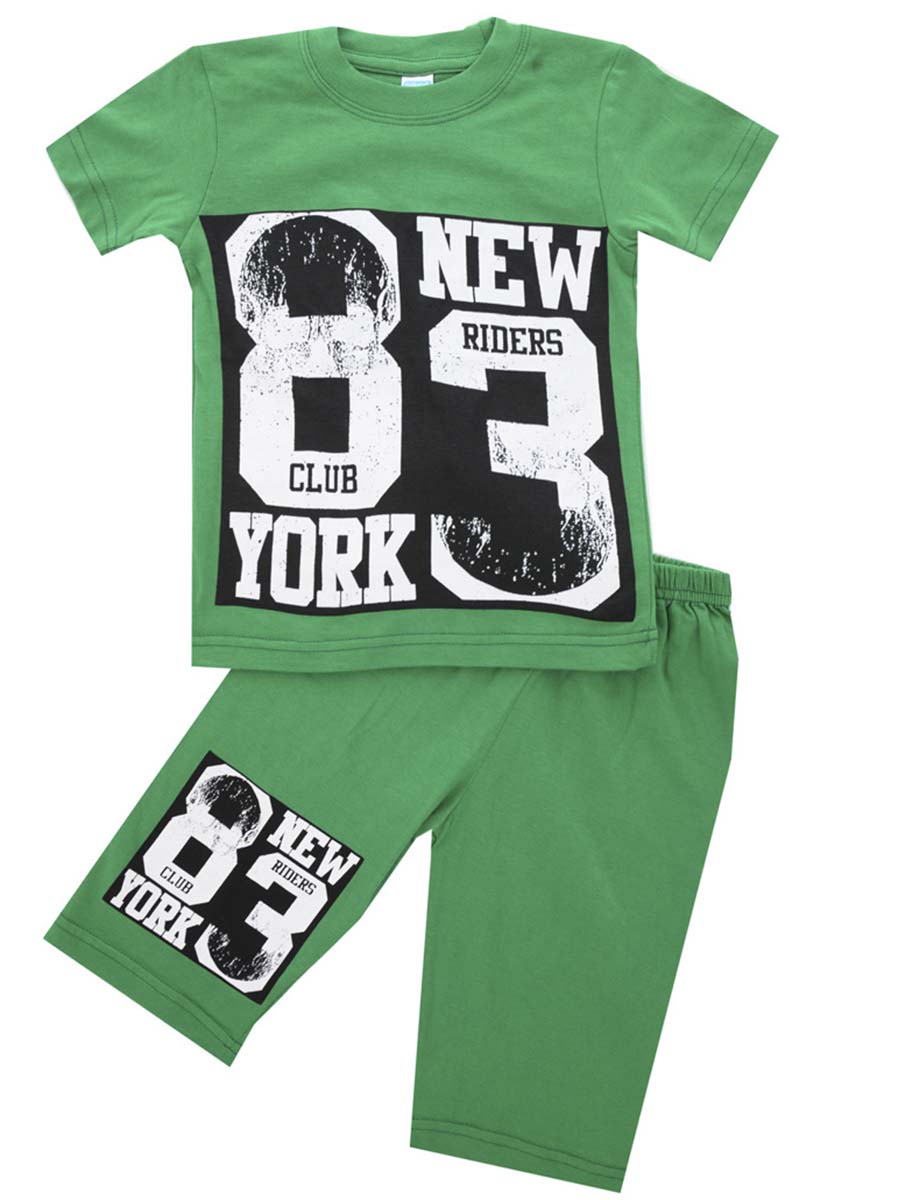 Костюм для мальчика зеленого цвета с принтом на передней части изделия.