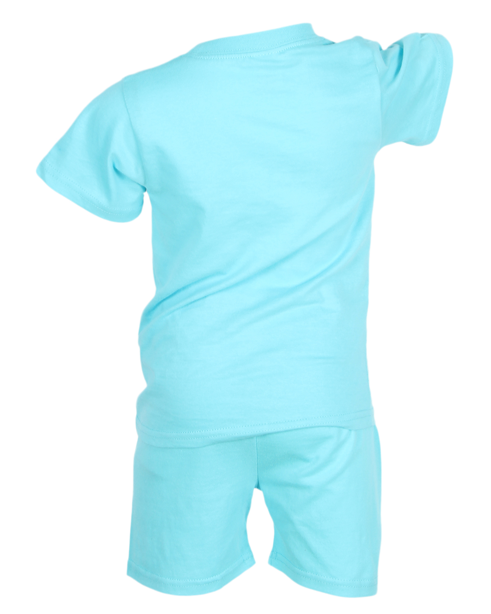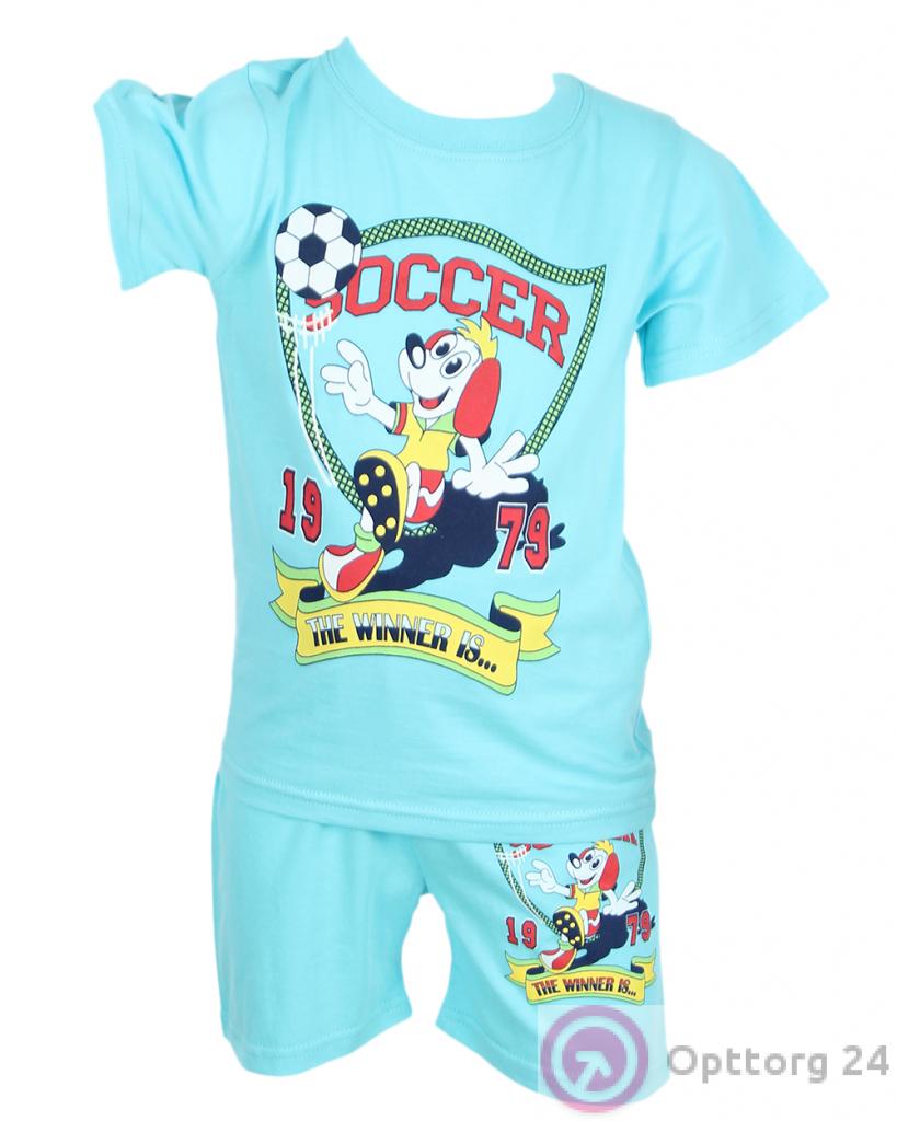 Трикотажный костюм состоящий из шорт и футболки. Модель украшена рисунком собачки-футболиста и надписью.