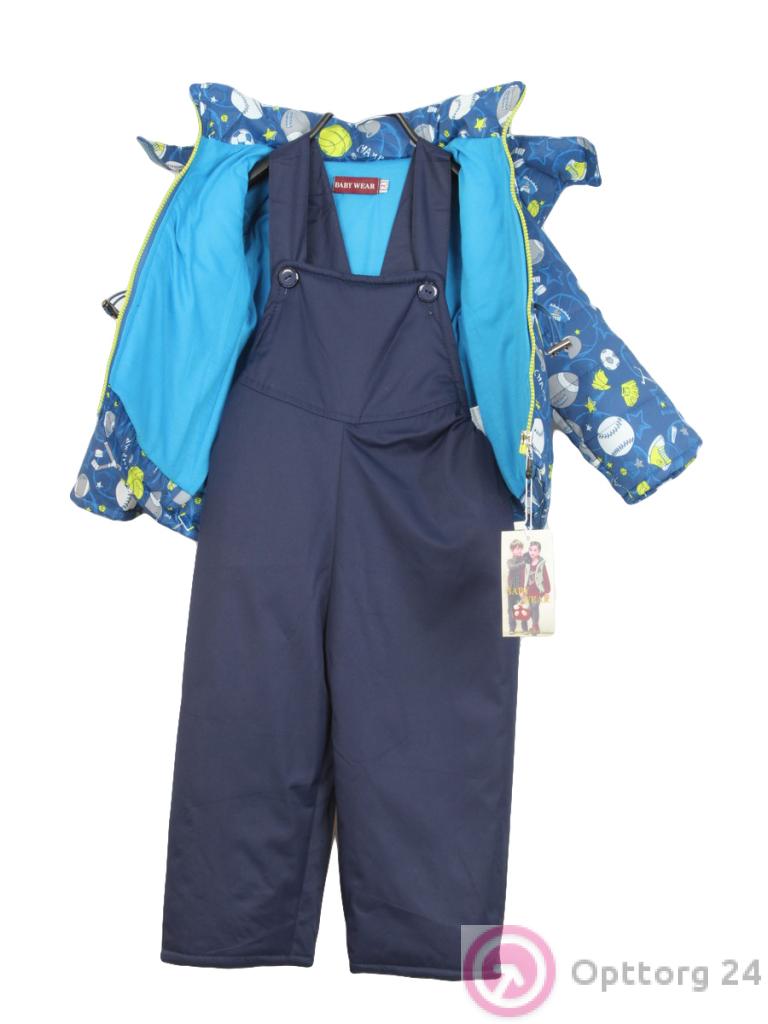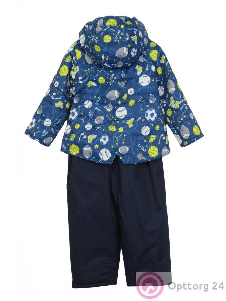 Теплый детский костюм синего цвета из синтепона, состоящий из комбинезона на лямках и куртки. Комбинезон практичный и удобный. Куртка с рисунком на спортивную тематику имеет капюшон без меха и карманы, ширина талии меняется с помощью завязок.