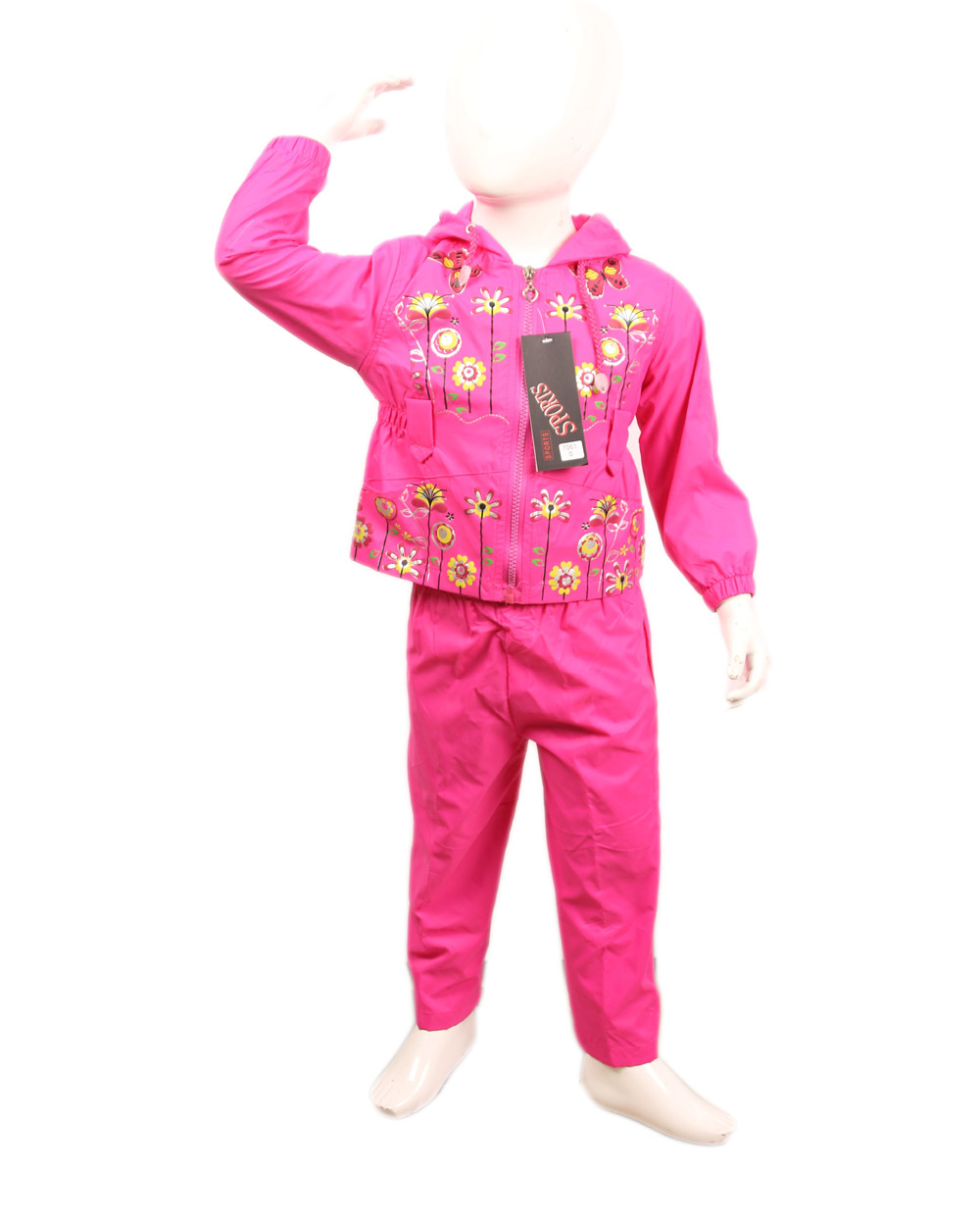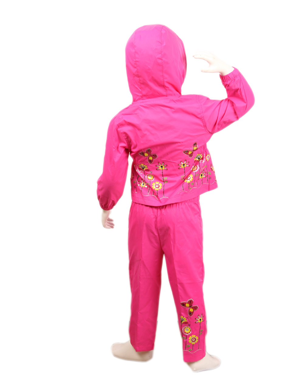 Очень красивый ветрозащитный костюм для девочек от 1 до 5 лет. Куртка и штаны выполнены в розовом цвете с принтом в виде цветочков и бабочек. Застегивается на молнию, капюшон несъемный. На талии вставлена резинка. Также куртку можно подоясать ремнем, для этого пришиты широкие лямки в области талии. Отличное качество пошива и ткани.