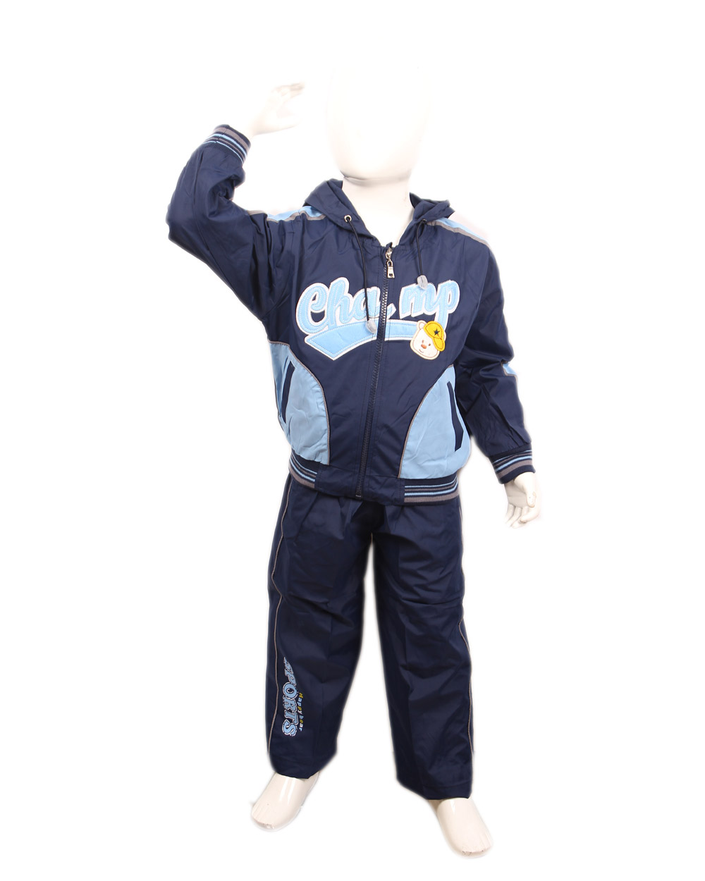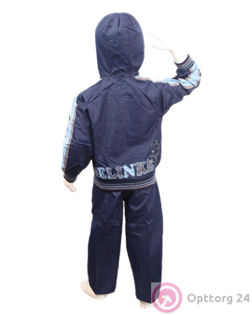 Симпатичный костюм из ветровочной ткани для прогулок на свежем воздухе. Куртка и штаны выполнены в одном цвете - темно-синем. Спереди куртки вставки голубого цвета и большая надпись, сзади принт. Застегивается на молнию, капюшон несъемный. Боковые карманы. Отличное качество пошива и ткани.