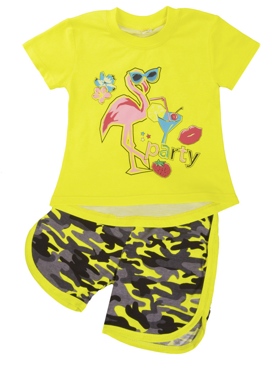 Детский комплект для девочки шорты +футболка. Комплект желтого цвета с принтом .