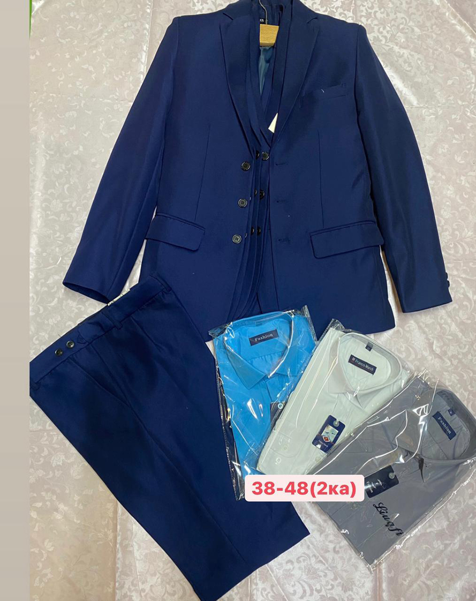 Описание: Костюм-двойка подростковый для мальчика, однотонный темно-синего цвета, состоит из: пиджака и брюк. Пиджак застегивается на трех пуговицах. Брюки с карманами и шлевками для ремня. Брюки с регулятором размера.