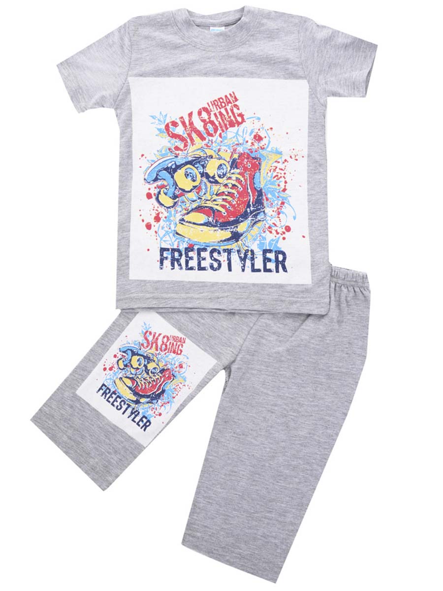 Костюм серого цвета футболка + шорты на передней части изделия нанесён принт.
