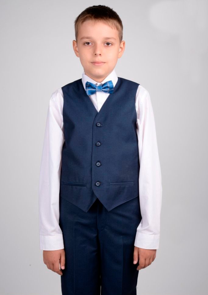 Описание: Костюм-двойка школьный для мальчика жилет и брюки классического кроя, однотонный, синий.