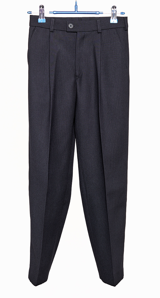 Описание: Костюм на подкладе черного цвета, пиджак двубортный на трех пуговицах, сзади разрезы, брюки со шлевками, маленькие размеры брюк с регулятором-резинкой.