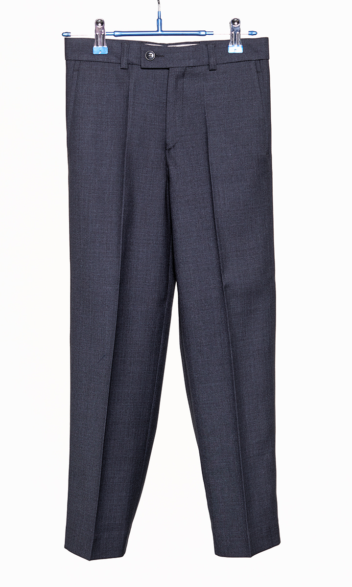 Описание: Костюм на подкладе серого цвета, пиджак двубортный на трех пуговицах, сзади разрезы, брюки со шлевками, маленькие размеры брюк с регулятором-резинкой.