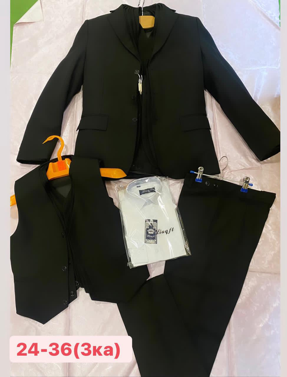 Описание: Костюм-тройка школьный для мальчика, однотонный черного цвета, состоит из: пиджака, жилета и брюк. Пиджак застегивается на трех пуговицах, жилет так же застегивается на трех пуговицах. Брюки с карманами и шлевками для ремня.