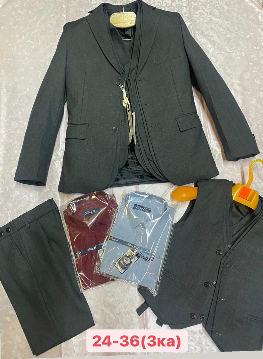 Описание: Костюм-тройка школьный для мальчика, однотонный серого цвета, состоит из: пиджака, жилета и брюк. Пиджак застегивается на трех пуговицах, жилет так же застегивается на трех пуговицах. Брюки с карманами и шлевками для ремня.