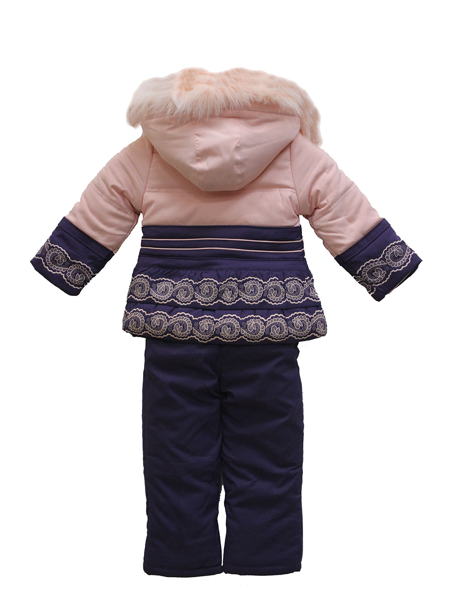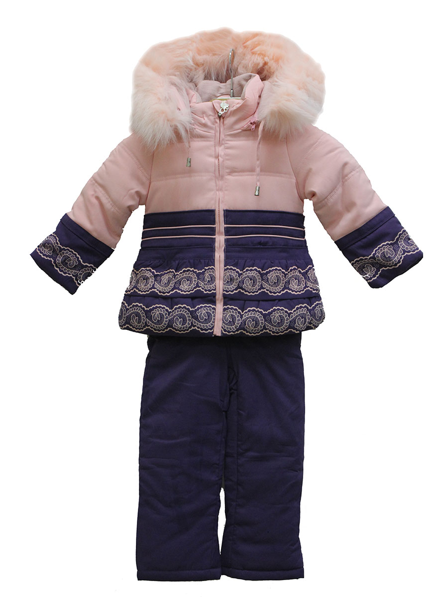 Описание: Костюм зимний для девочки розово-синего цвета. Состоит из куртки со съемной меховой подстежкой и напульсниками застежка на молнии, полукомбинезон с напульсниками и регулируемыми бретелями.