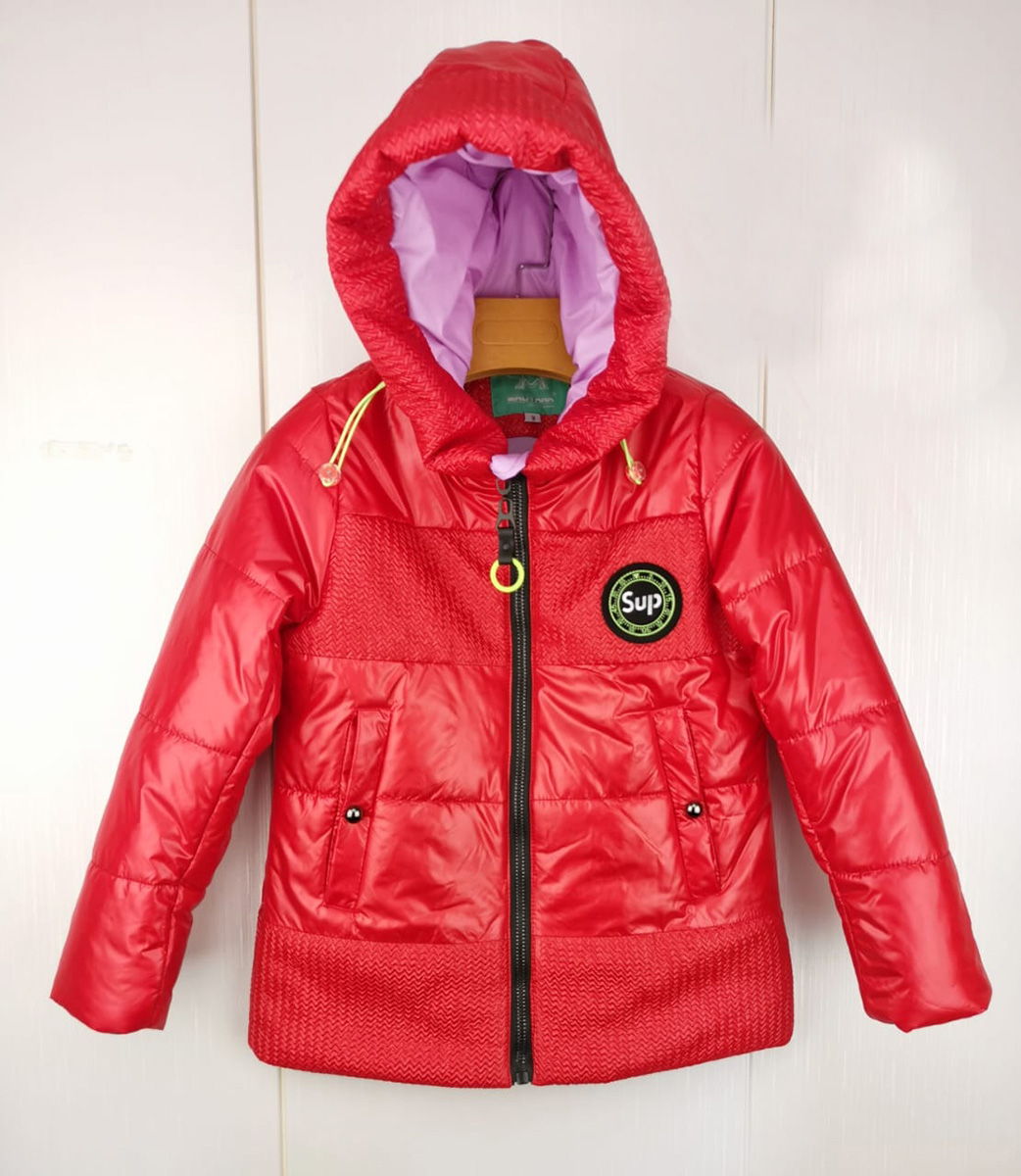 Описание: Куртка демисезонная для девочки комбинированная цвет алый. Высокий воротник. Застежка на молнии. Есть капюшон и два кармана. На груди эмблема.