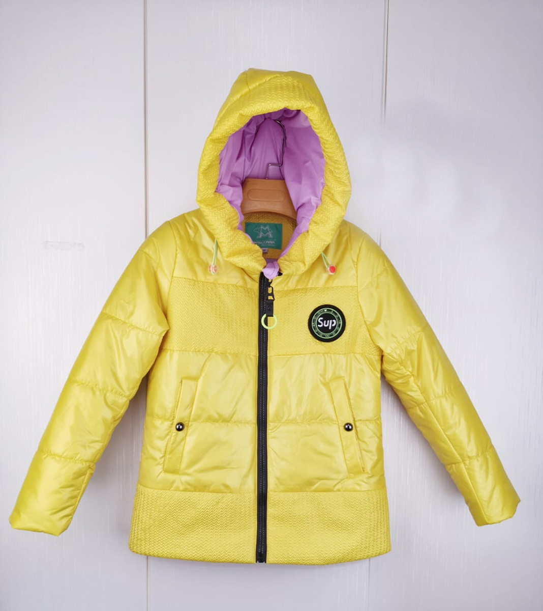 Описание: Куртка демисезонная для девочки комбинированная цвет желтый. Высокий воротник. Застежка на молнии. Есть капюшон и два кармана. На груди эмблема.