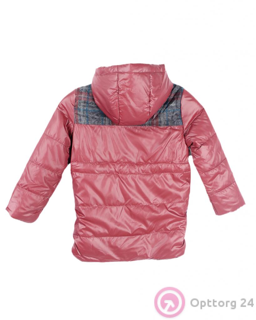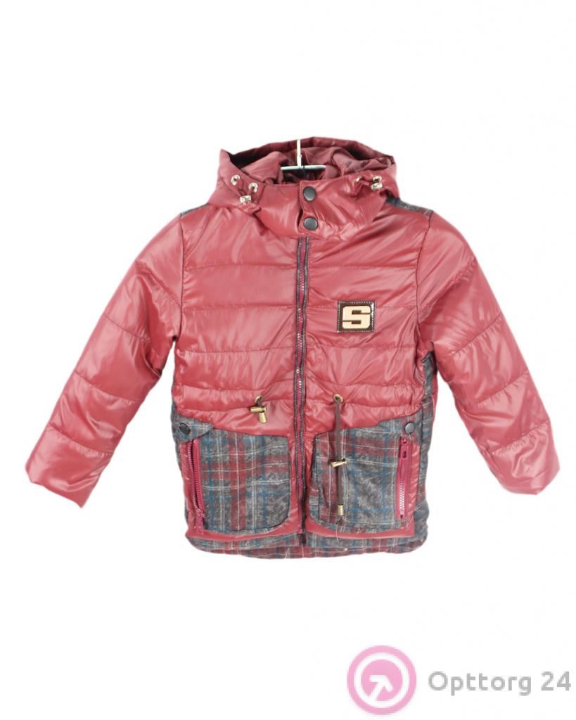 Детская куртка бордового цвета с принтом на карманах спереди. Модель имеет капюшон, воротник-стойку и шнурок-утяжку на талии.