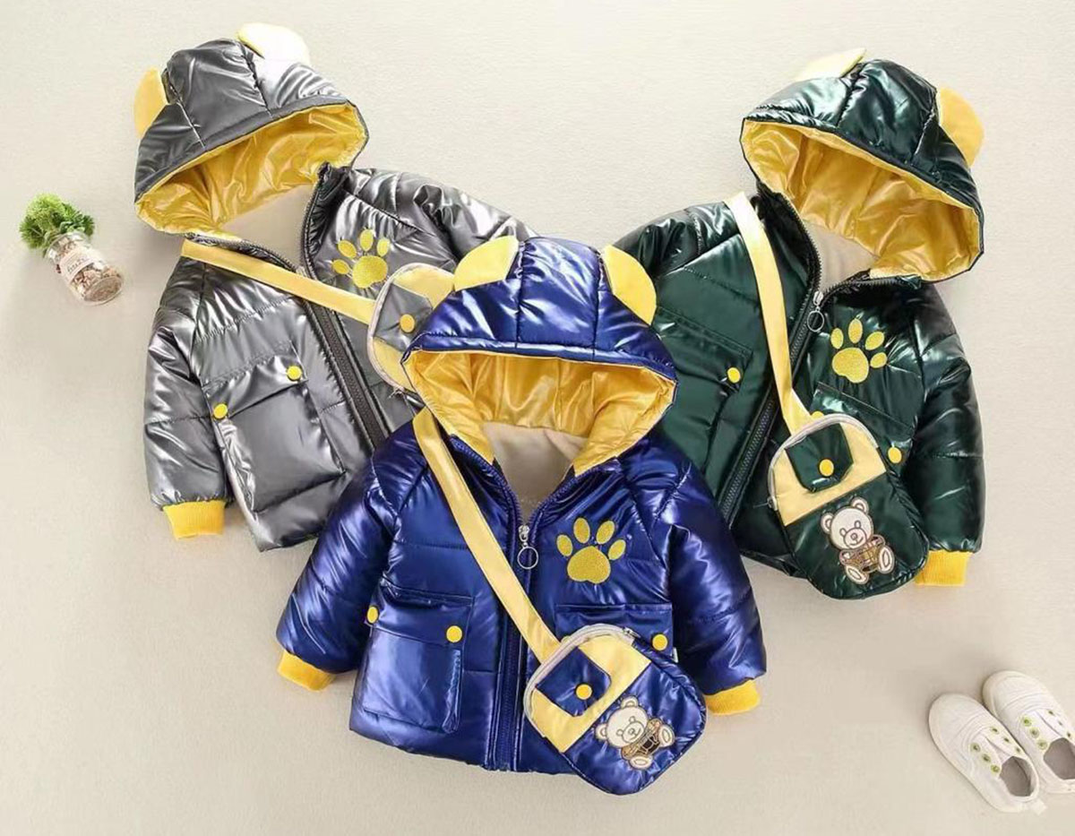 Описание: Куртка детская демисезонная с сумочкой. Капюшон декорирован ушками. Застежка на молнии. Есть два накладных кармана. Манжеты рукавов на широкой трикотажной резинке.