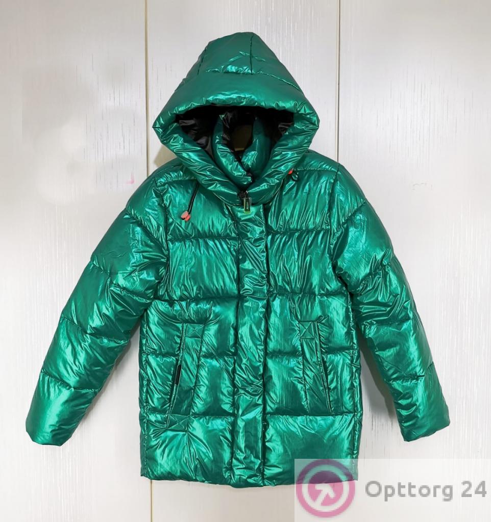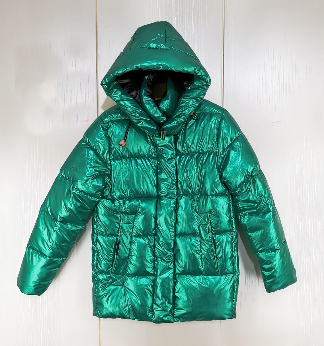 Куртка выполнена в изумрудном цвете с металлическим отливом, удлиненная, стеганная.