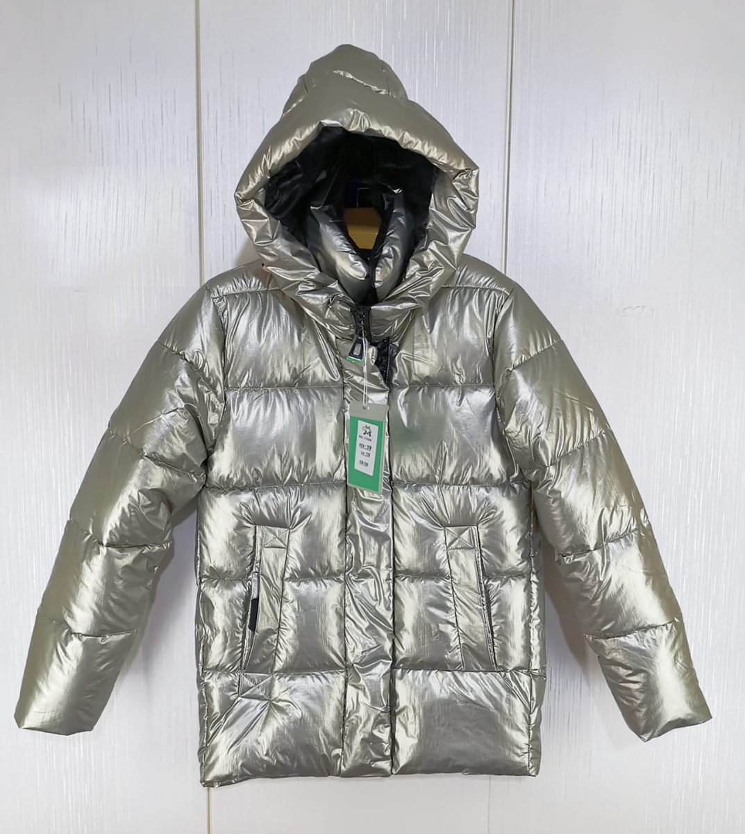 Куртка выполнена в серебристом цвете с металлическим отливом, удлиненная, стеганная.