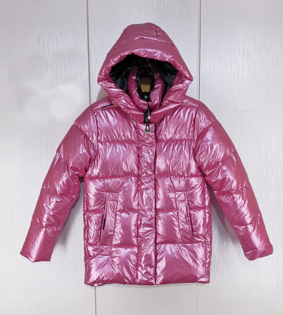 Куртка выполнена в розовом цвете с металлическим отливом, удлиненная, стеганная.
