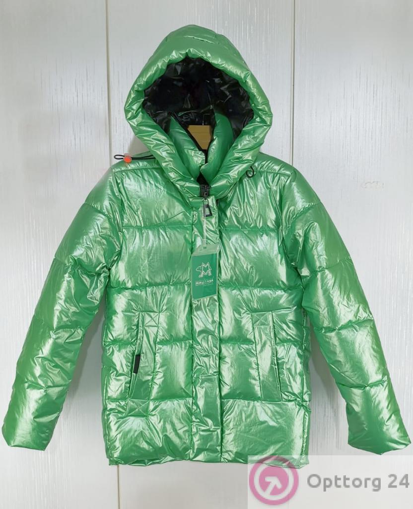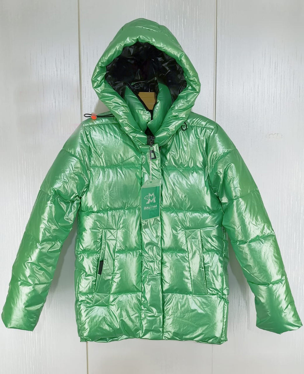 Куртка выполнена в нежно-зеленом цвете с металлическим отливом, удлиненная, стеганная.