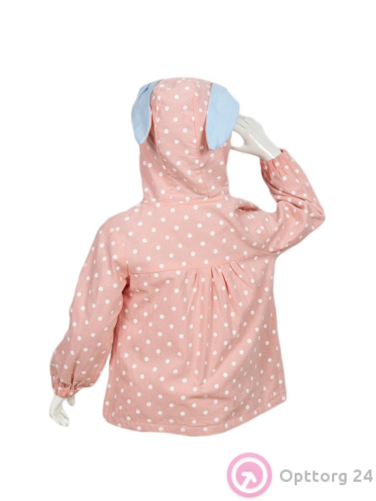 Куртка детская для девочки кремово-розового цвета в белый горошек. Модель имеет на капюшоне ушки.