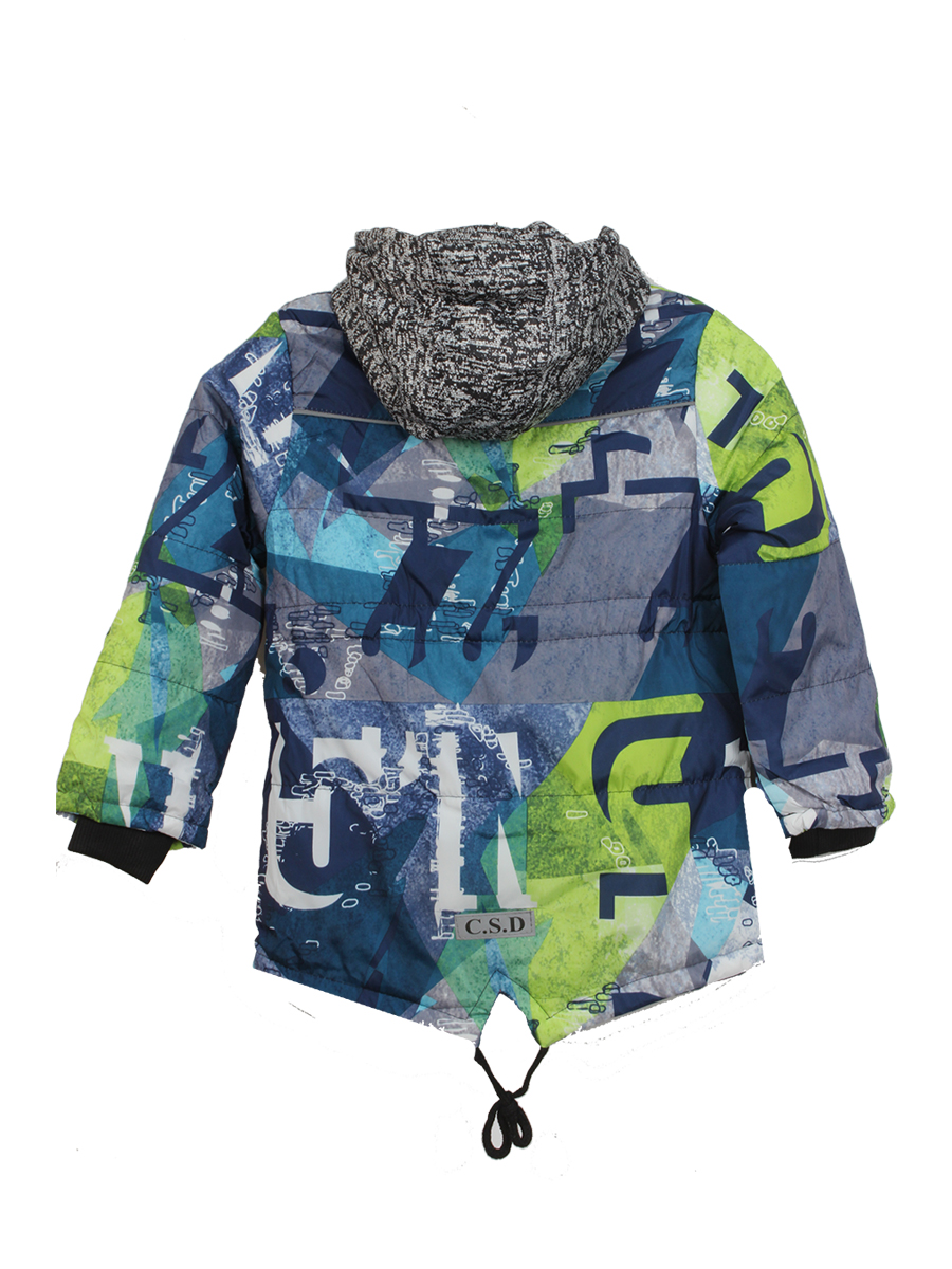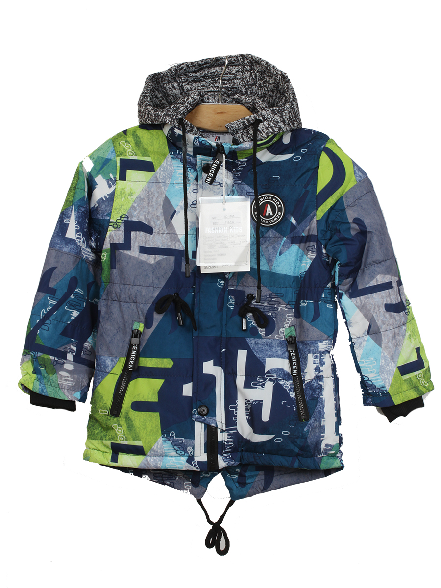 Высокое качество изделий. Стиль современный. Куртка детская для мальчика темная с ярким принтом и капюшоном