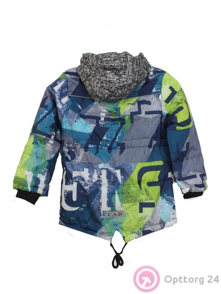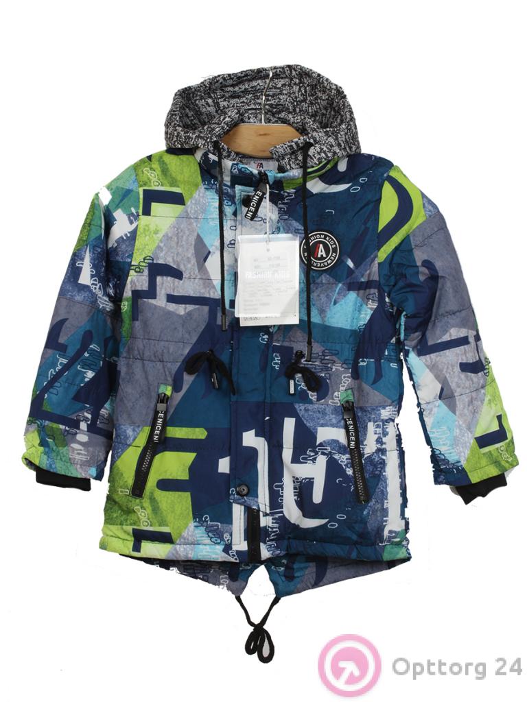 Куртка детская для мальчика темная с ярким принтом и капюшоном оптом