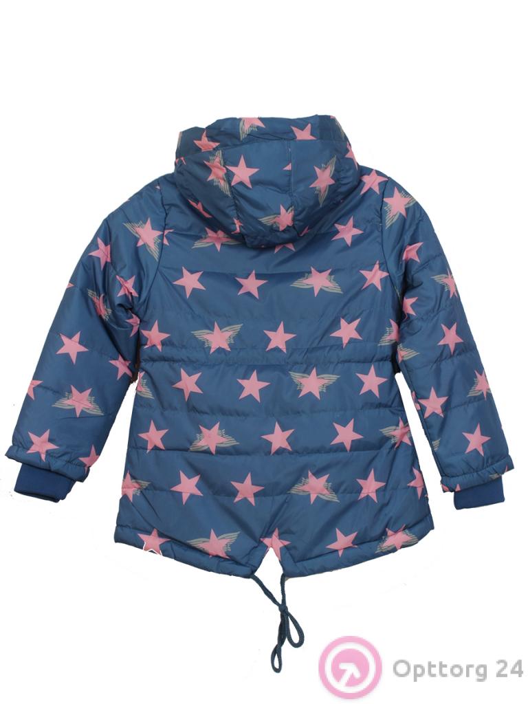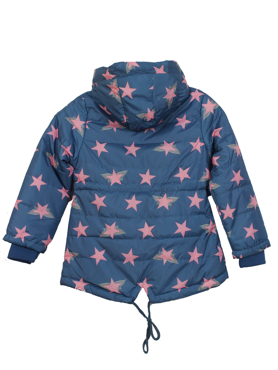 Детская куртка для девочки, низ удлиненный, на шнуровке. Есть капюшон. Цвет синий, розовые звезды.
