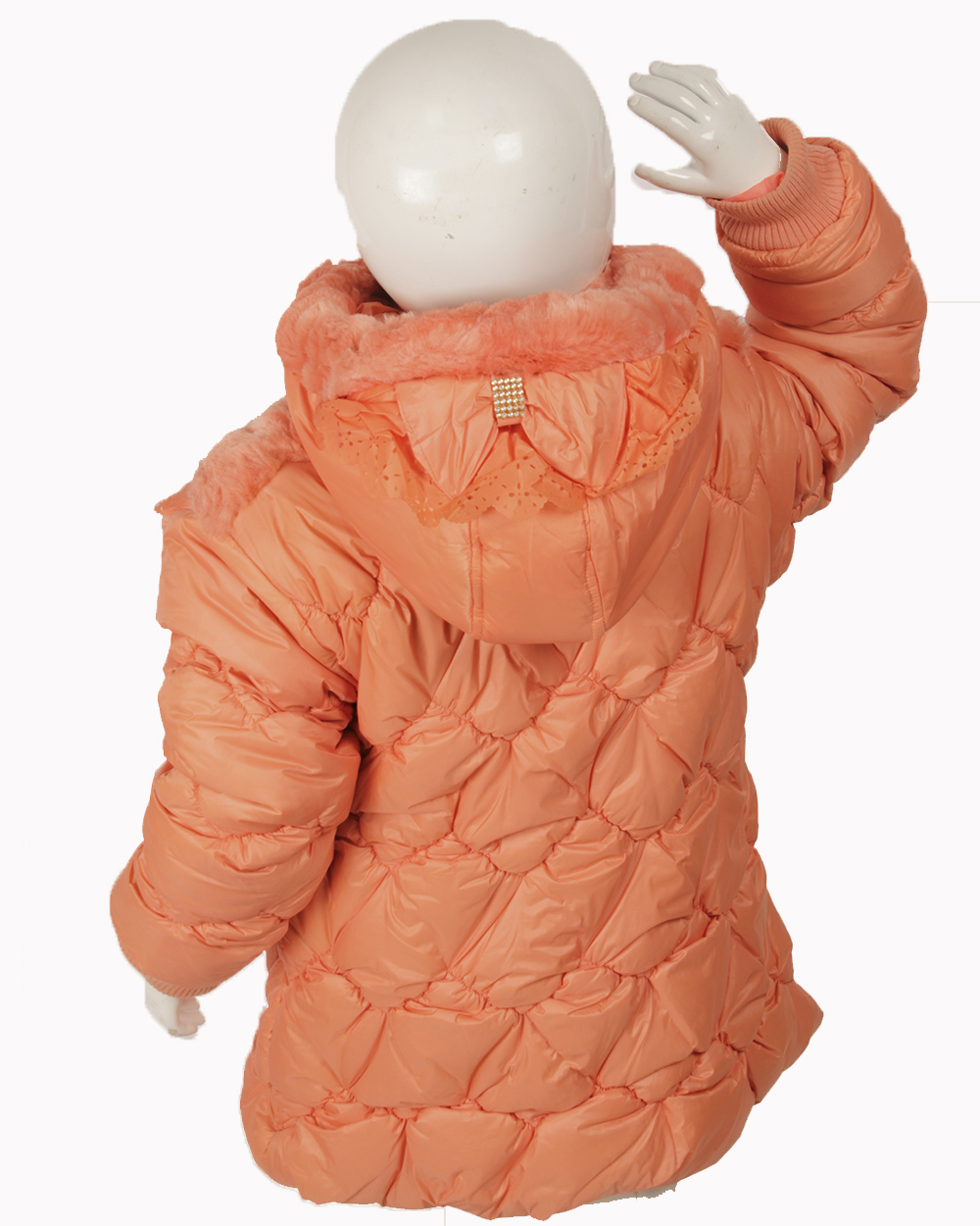 Детская куртка для девочки украшена мехом в области плеч и капюшона