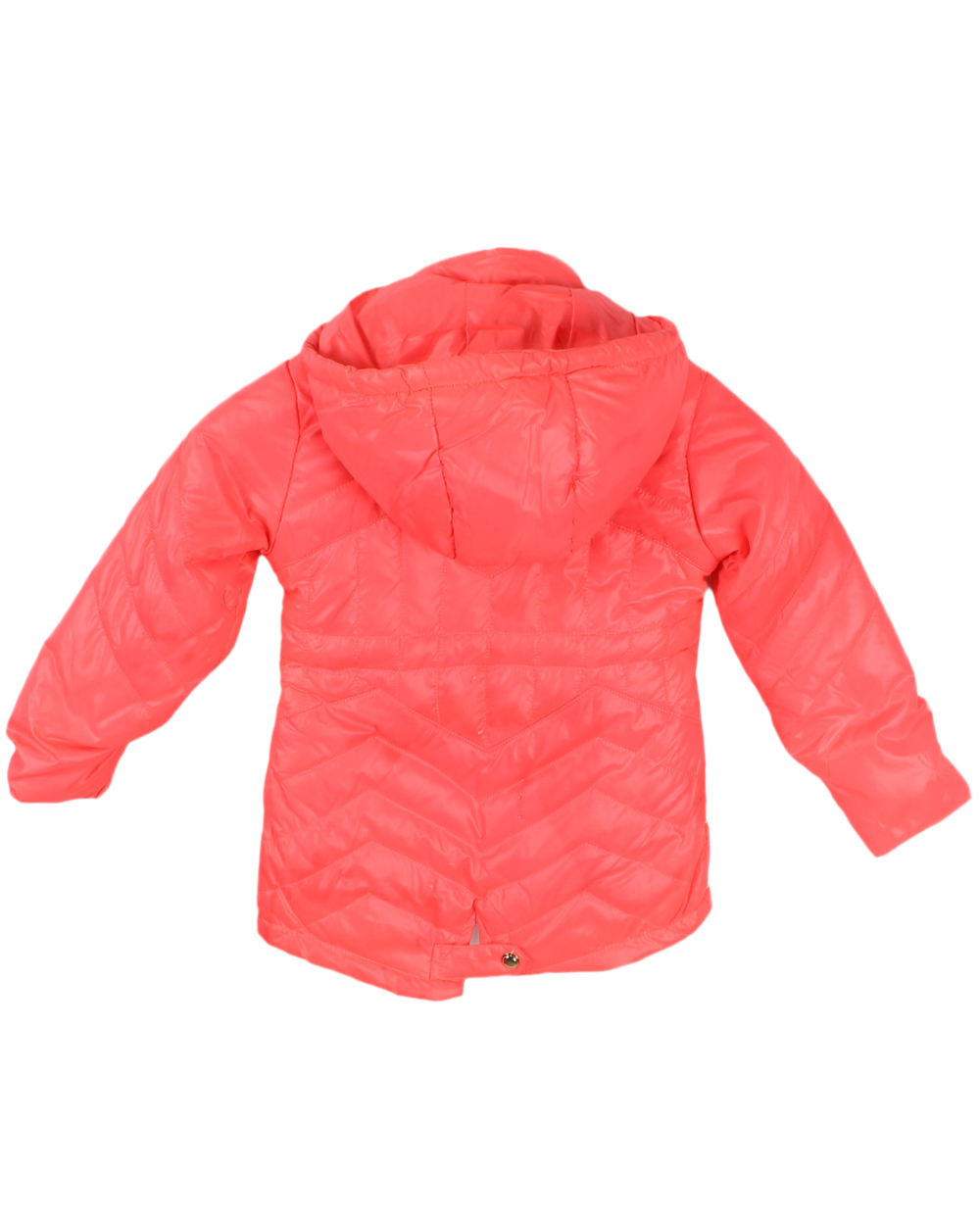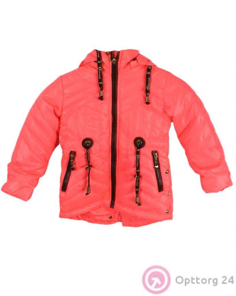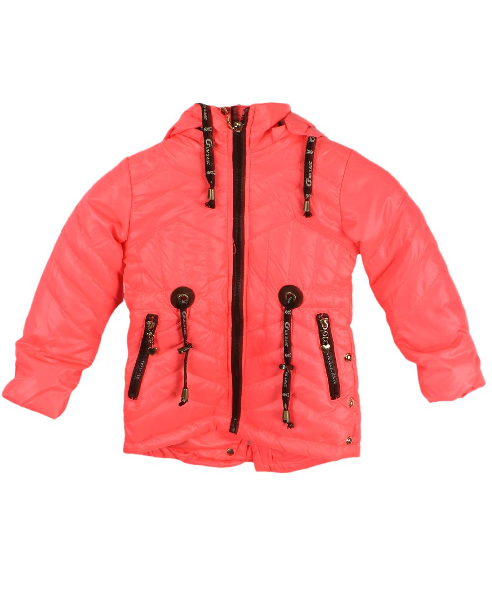 Детская куртка для девочки. Модель имеет черные карманы на молнии. Чуть выше линии талии есть шнурок-утяжка.