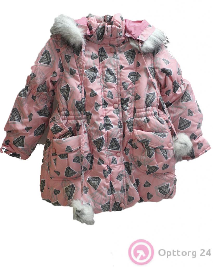 Детская куртка на синтепоне. нежно-розового цвета с принтом в виде брилиантов и мягкой синтетической опушкой на капюшоне.