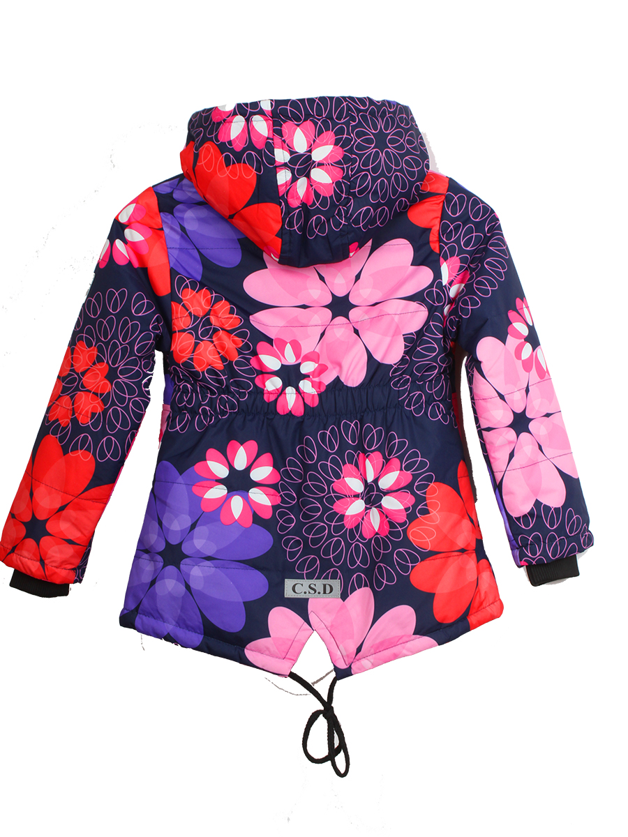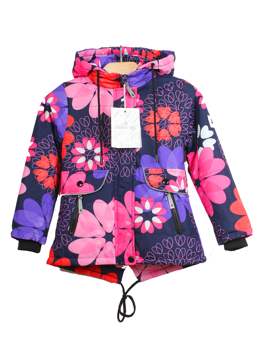Высокое качество изделий. Стиль современный. Куртка детская с цветами фиолетового цвета для девочки. Есть капюшон.
