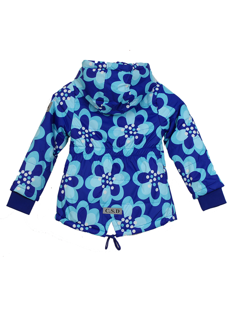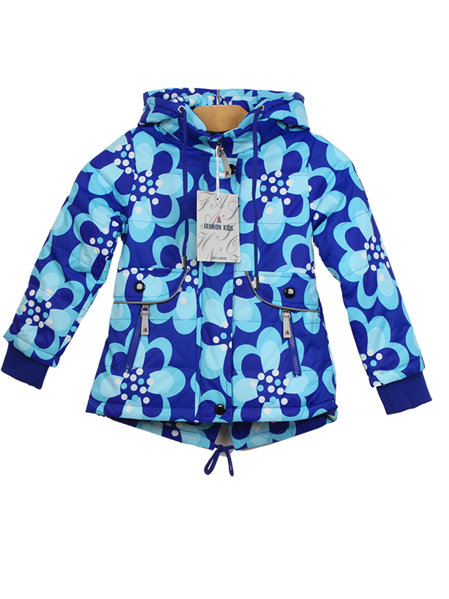 Высокое качество изделий. Куртка детская с цветами голубого оттенка темного-синего цвета для девочки. Стиль современный.