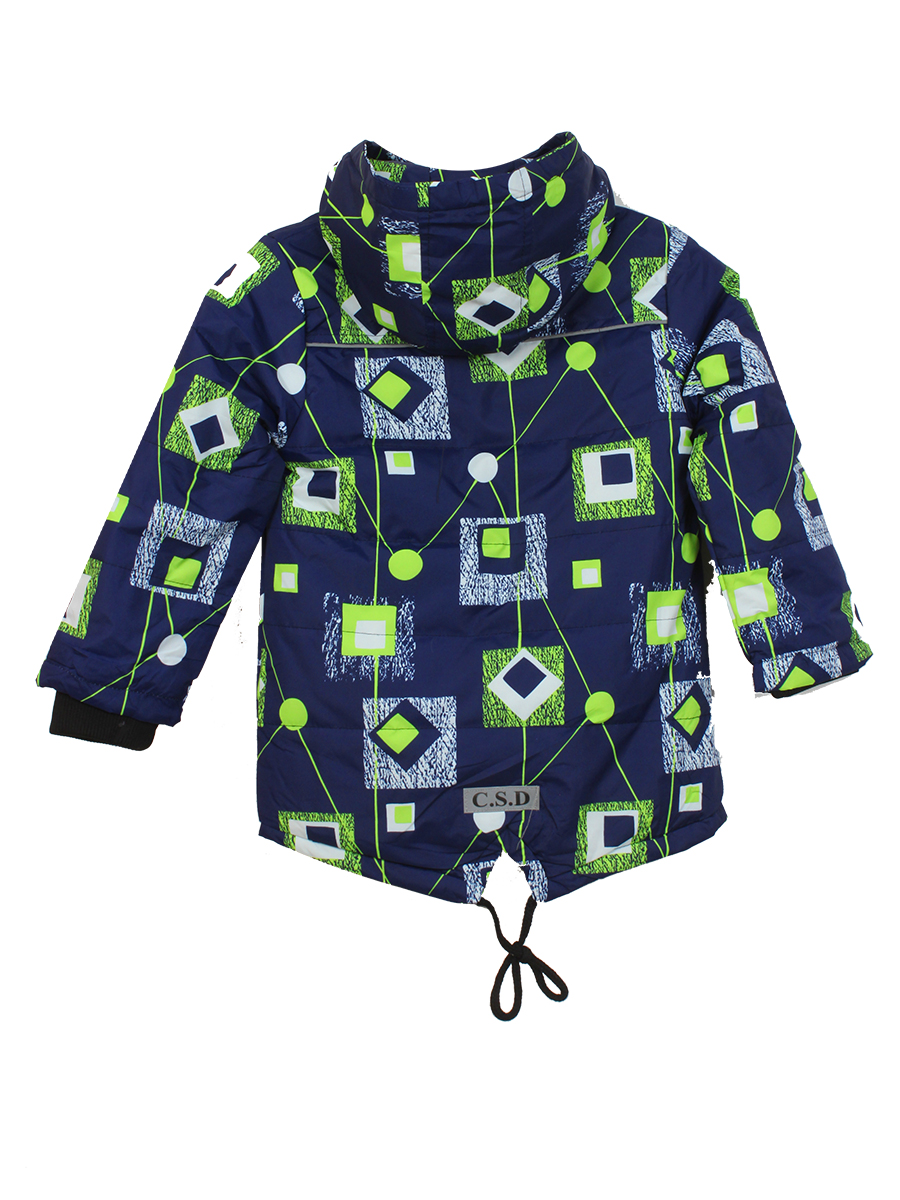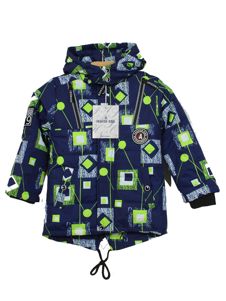 Высокое качество изделий. Стиль современный. Куртка детская с салатовыми фигурами темного синего цвета