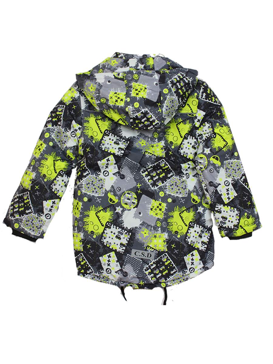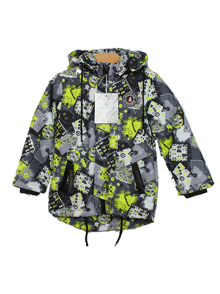Высокое качество изделий. Стиль современный. Куртка детская серого цвета с принтом ярко-салатовым для мальчика