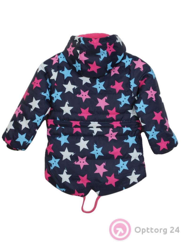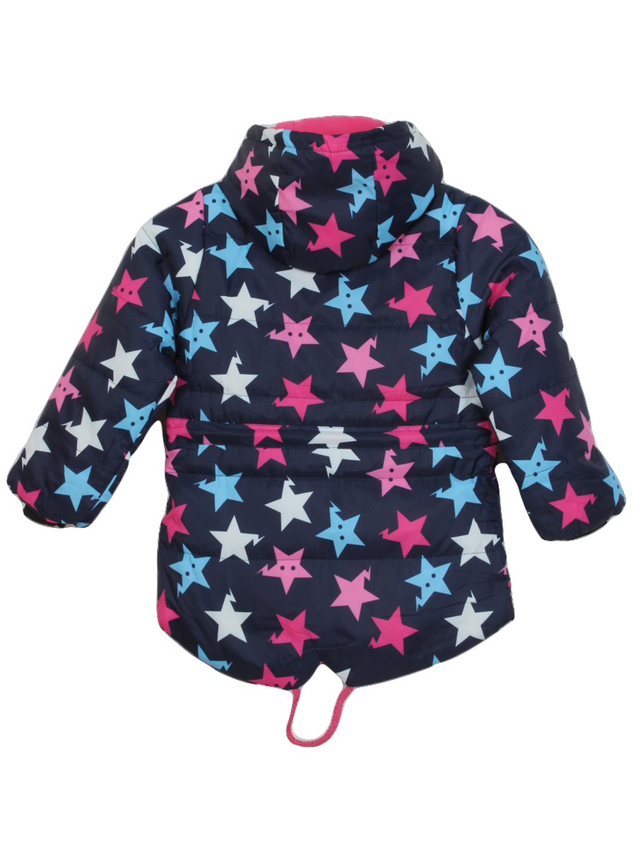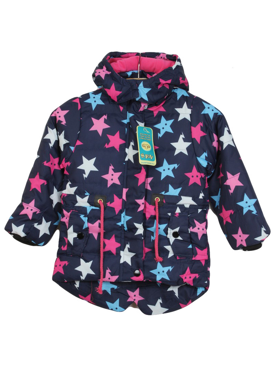 Демисезонная синяя куртка для детей с принтом в виде звезд. Стильная модель с капюшоном без меха. Спереди изделия карманы. Застежка на молнии и кнопках.