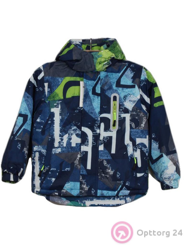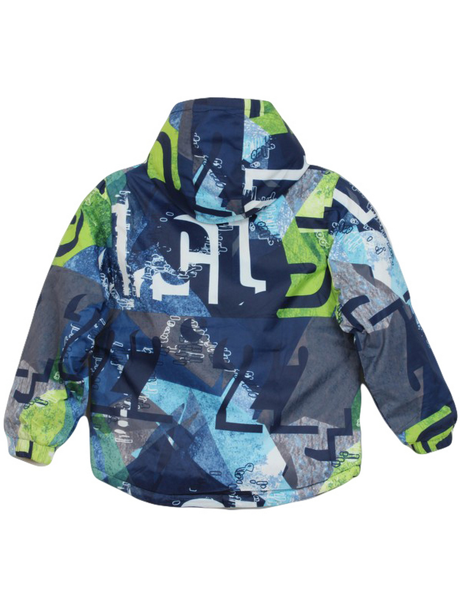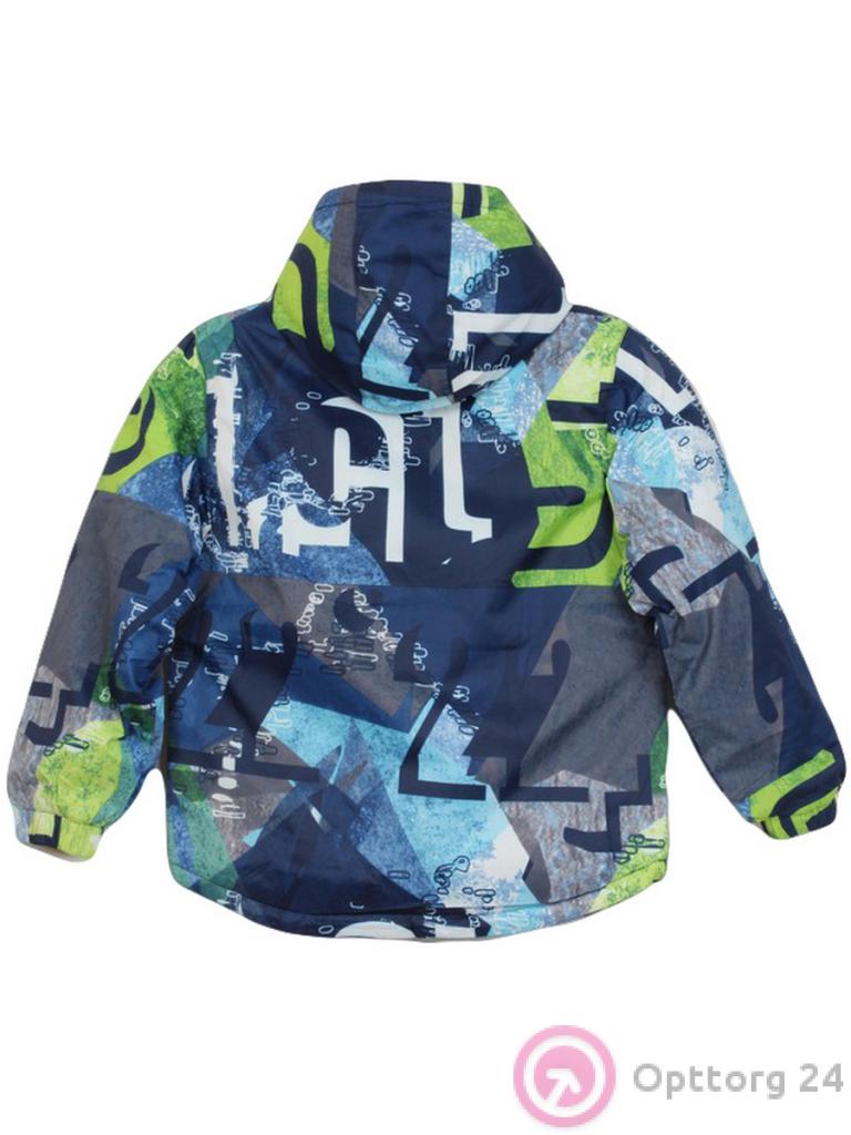Демисезонная сине-зеленая куртка для детей с рисунком. Стильная модель с капюшоном без меха. Спереди изделия карманы. Застежка на молнии и кнопках.