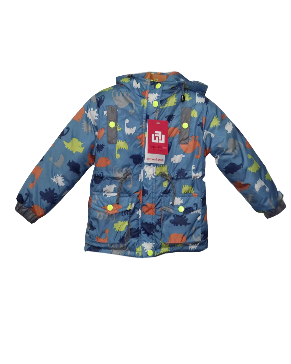 Детская куртка с милыми разноцветными динозавриками. Капюшон утягивается с помощью шнурка. По линии пояса также есть утягивающий шнурок.