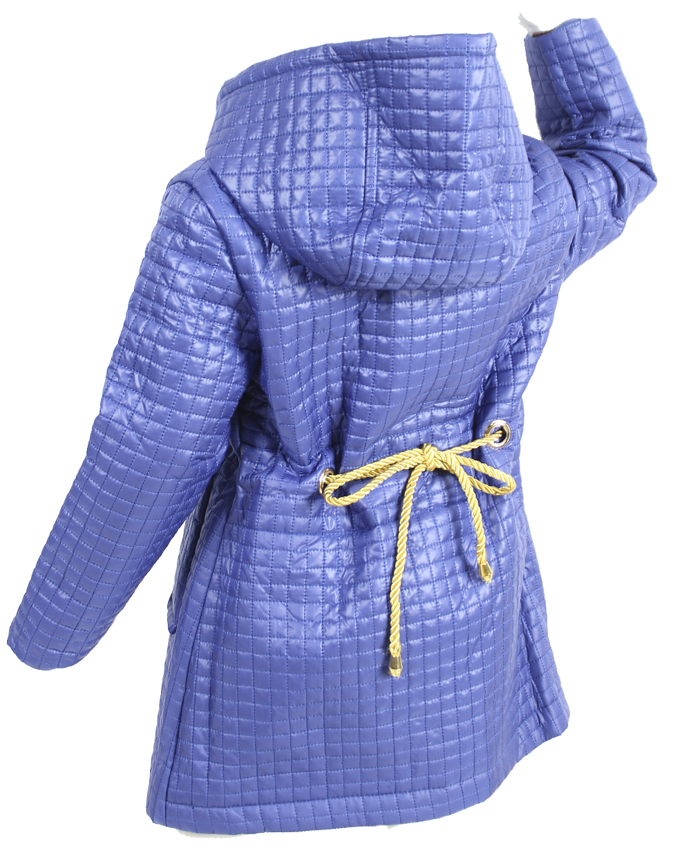 Детская куртка для девочек синего цвета с золотистым поясом.
