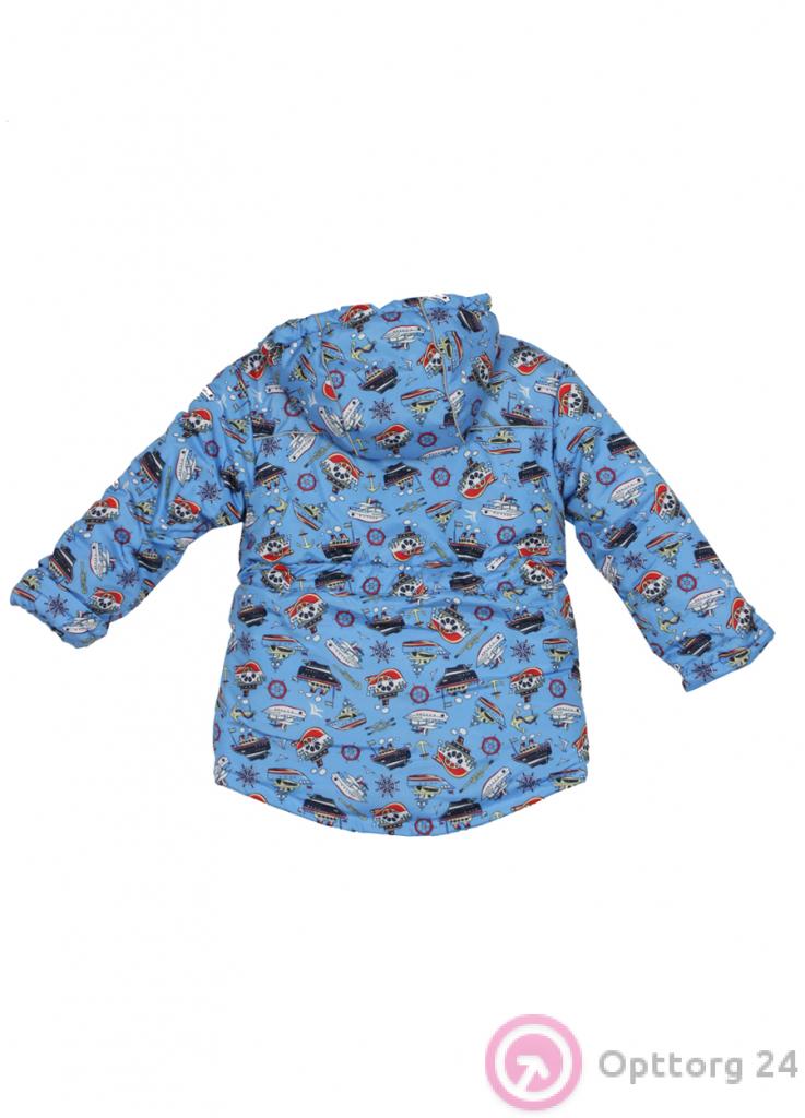 Красивая голубая детская куртка. По всему изделию изображены принты морской тематики. Куртка очень теплая и удобная, имеет капюшон с резинками, удлиненный крой сзади и застежку-молнию с защитной планкой