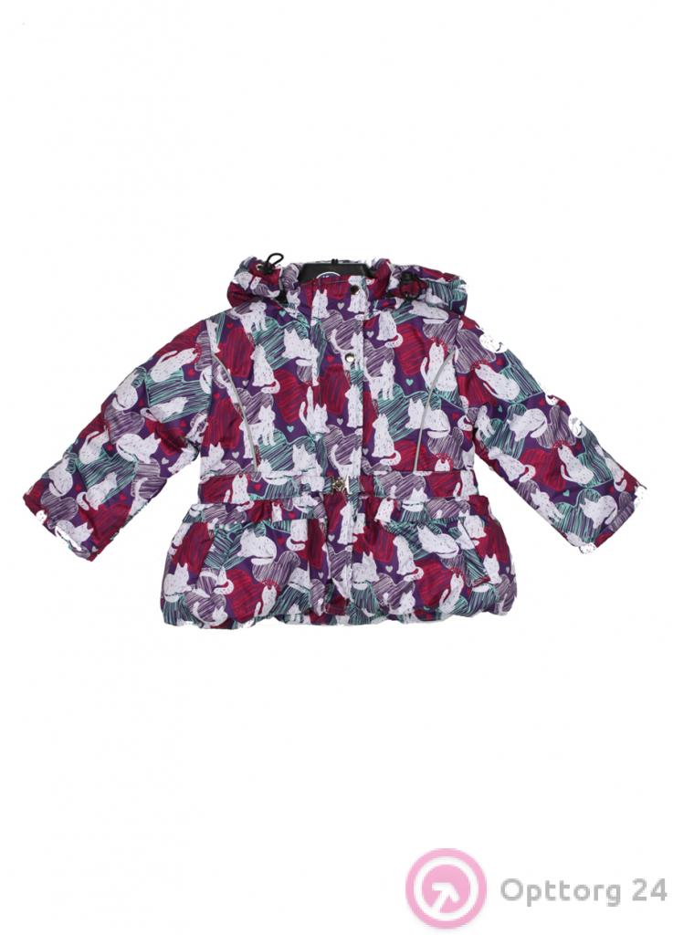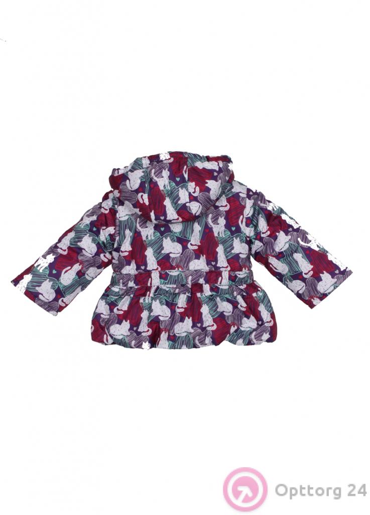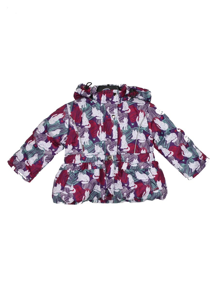 Оригинальная куртка для девочки с основой фиолетового цвета, имеет красные и светло-зеленые принты в виде сердец и белые в виде кошек. Имеет три вида застежек - молнию, пуговицы и пояс, удобные карманы и капюшон