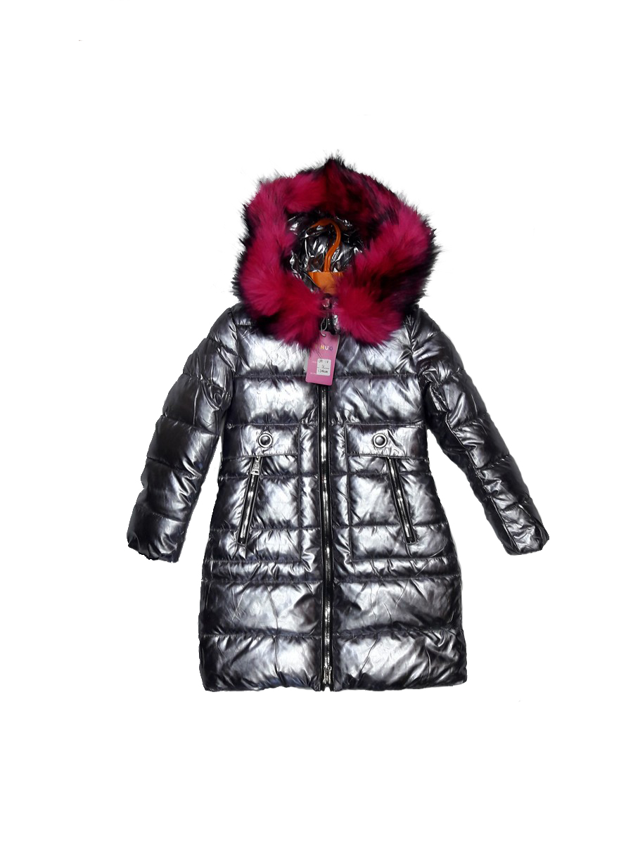 Куртка для девочки черного зеркального цвета с металлической молнией по центру и капюшоном с красным мехом. По бокам расположены карманы.