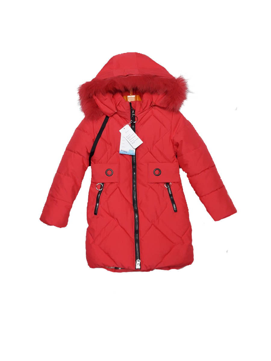 Куртка для девочки красного цвета с металлической молнией по центру и капюшоном с мехом. Яркая и нарядная.